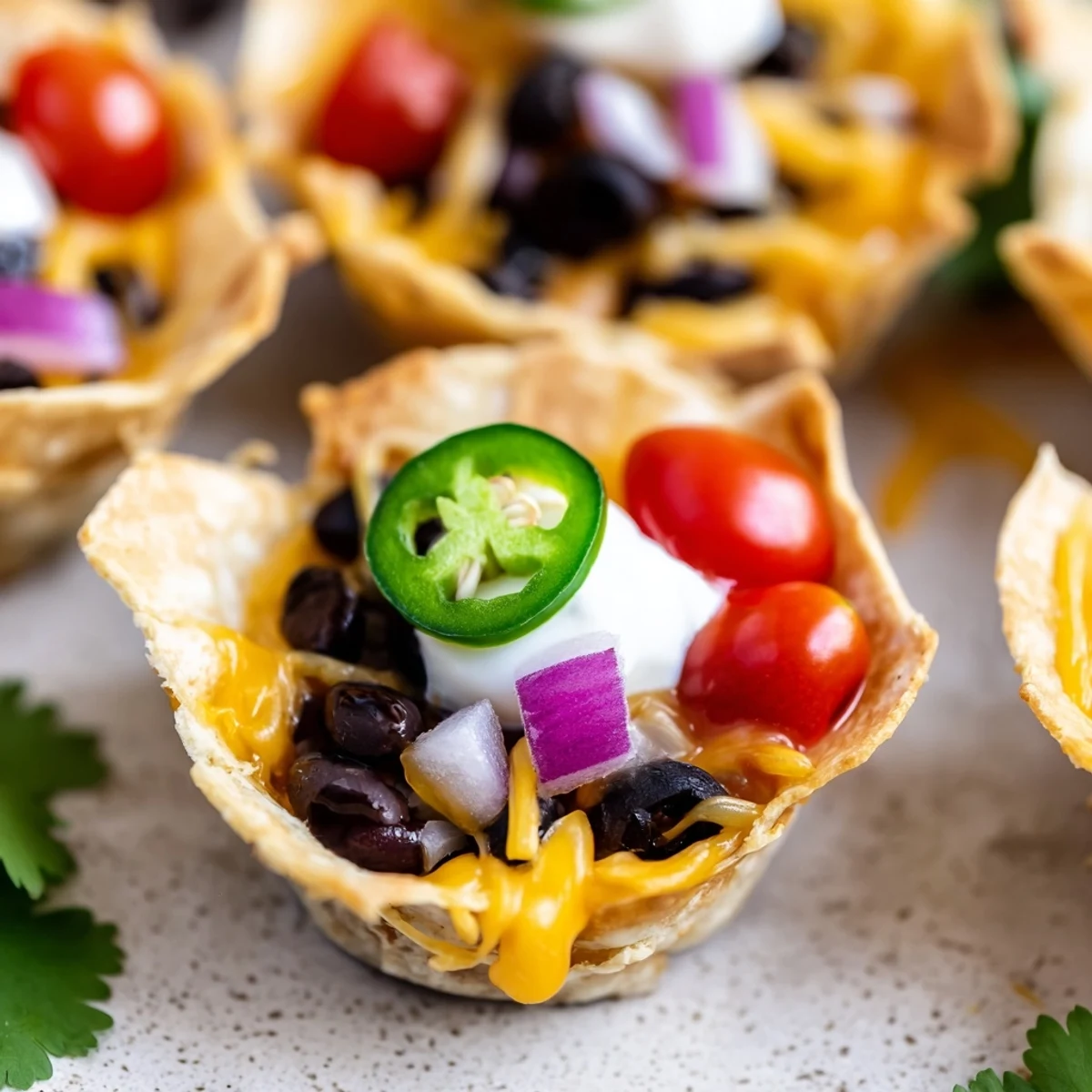 Transform scoop-style tortilla chips into crispy edible cups by arranging them in a mini muffin tin. Fill each with shredded cheddar and Monterey Jack, then pile on black beans, diced cherry tomatoes, black olives, red onion, and jalapeño slices. Bake at 375°F for 8-10 minutes until bubbly and golden. Finish with cool sour cream and fresh cilantro for that perfect hot-cold contrast. These handheld bites come together in just 25 minutes and disappear fast at any gathering.
