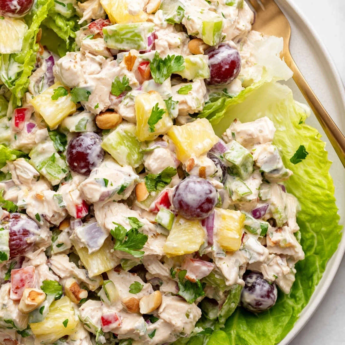 Combine diced cooked chicken with fresh pineapple, sliced celery, red bell pepper, red onion and halved grapes. Whisk mayonnaise, Greek yogurt, lime juice, honey and Dijon until smooth; toss to coat. Chill 15 minutes to meld flavors, then garnish with cilantro and toasted macadamias. Serve on butter lettuce or in halved pineapple. Swap yogurt for extra mayo for dairy-free, or use cashews for nut-free.